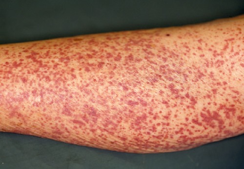 При этом образуются пятнисто-синяковые высыпания на коже и кровоизлияние на слизистых оболочках. Сыпь может быть разной формы и размера, расположена ассиметрично. Часто образуется даже без травмы или другого внешнего воздействия.