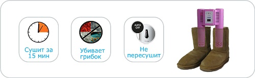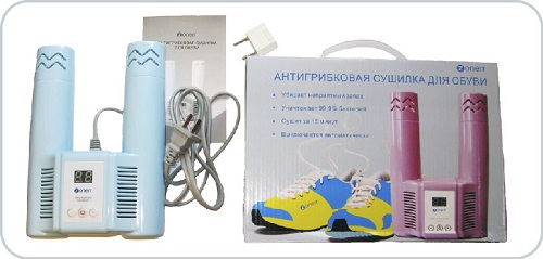 Кроме описанных выше методов, обработать обувь также можно с использованием специального прибора, предназначенного для дезинфекции и сушки ультрафиолетом. Использование этого метода абсолютно безвредно как для самих изделий, так и для людей и животных. Ультрафиолетовые лучи убивают споры грибка и любые другие бактерии. Данные приборы работают при температуре около 70 градусов, поэтому одновременно с дезинфекцией происходит еще и сушка обуви.