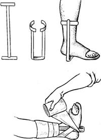 - Необходимо ступню зафиксировать в одном положении. Для этого на стопу следует наложить шину. Это может быть какая-то доска, которая прислоняется к месту травмы и прикрепляется с помощью бинта. Делать нужно всё очень осторожно, чтобы не усилить повреждение.