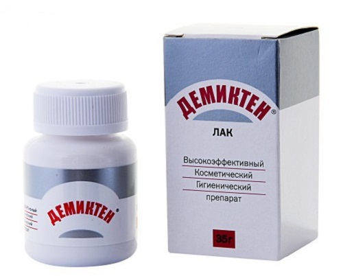 Лак для ногтей для лечения грибка ногтей Демиктен, после нанесения на ногтевую пластину образует защитную пленку, которая препятствует развитию повреждений. Действующим веществом в препарате является муравьиный альдегид, который помогает справиться с грибковым поражением и восстановить поврежденные участки. Для достижения лечебного эффекта, использовать следует ежедневно.