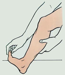 - Также можно обхватить стопу руками и потянуть носок на себя. Вероятно, вам будет больно, но потерпите. Напряжённая мышца растянется, напряжение спадёт. Когда спазм пройдёт, помассируйте икру, потрите её, постучите. Массаж разогреет мышцу и улучшит кровообращение.