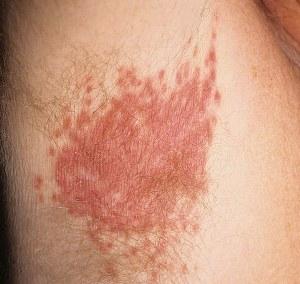 Зачастую поражение располагается в складках кожи подмышек и паха, в межпальцевом пространстве и под молочной железой.